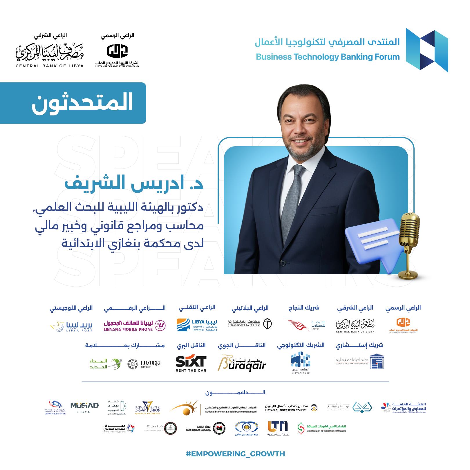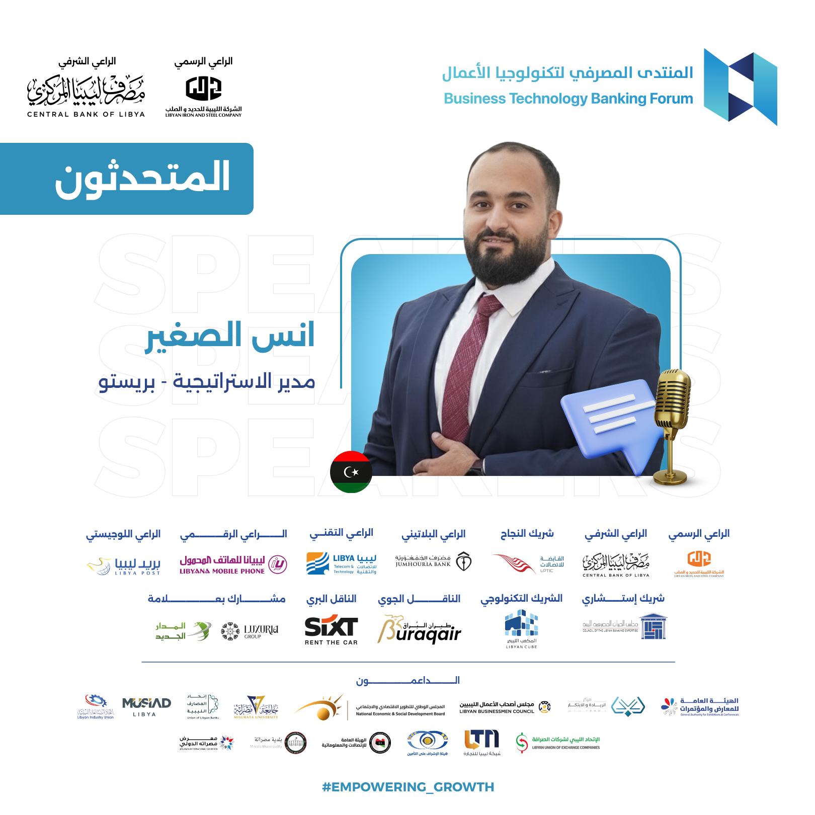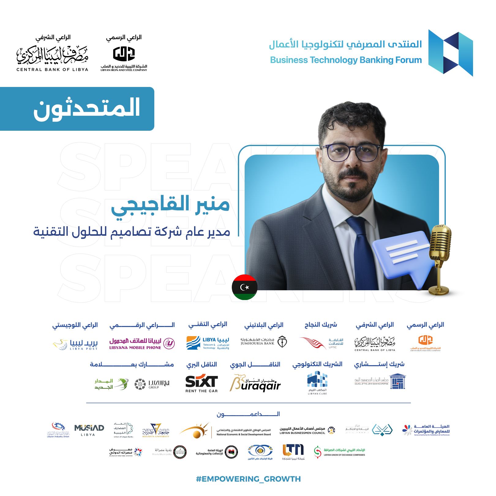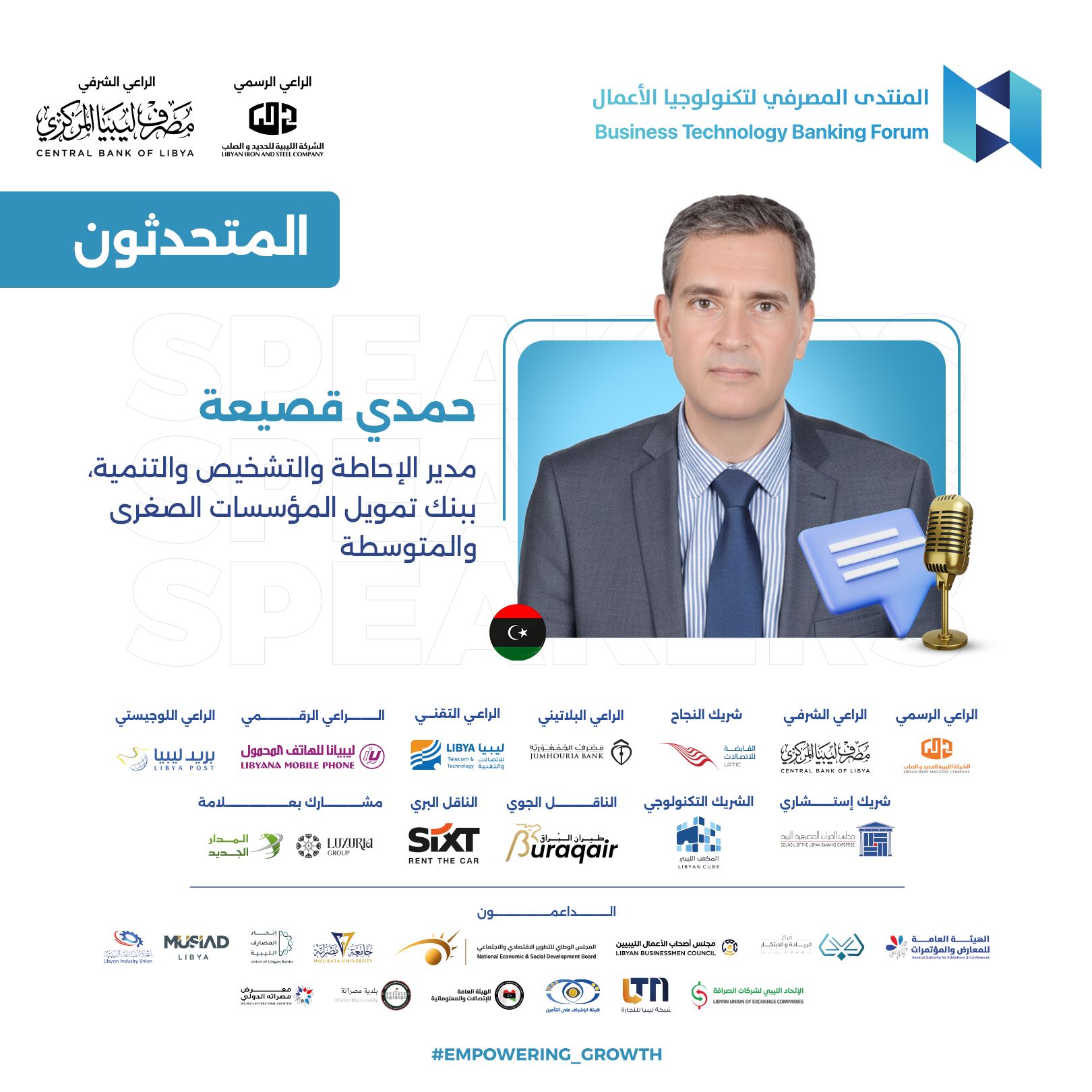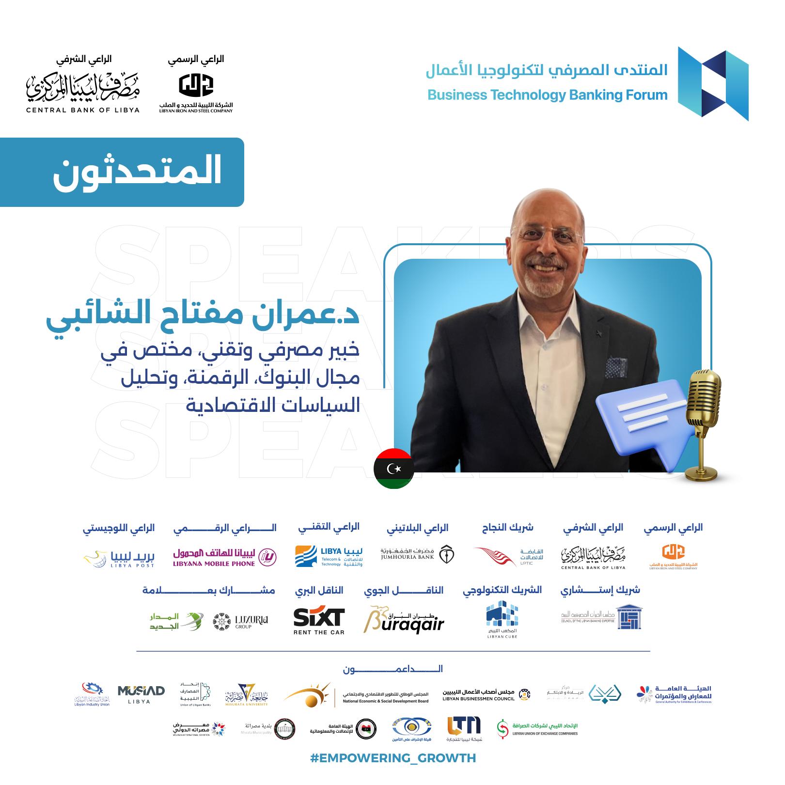 يسعدني أن أشارككم اليوم في هذا الحدث الهام، المنتدى المصرفي لتكنولوجيا الأعمال في دورته الثالثة، الذي نسعى من خلاله إلى دفع مسيرة تطوير العمل المالي والمصرفي في ليبيا. إن هذا المنتدى يمثل منصة متميزة لإطلاق أعمال وخدمات جديدة تسهم في تنمية قطاعنا المالي، وتدعم ترويج العلامات التجارية ذات الصلة، وتفتح آفاق التعاون بين المصارف وشركات التأمين والخدمات المساندة من جهة، والعملاء المحتملين والشركاء والمستثمرين من جهة أخرى، بما يتماشى مع رؤية مصرف ليبيا المركزي.